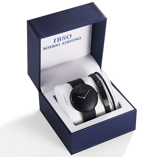 Men Silicone Strap or Leather Strap Quartz Watch and Black Bracelet Jewelry Set