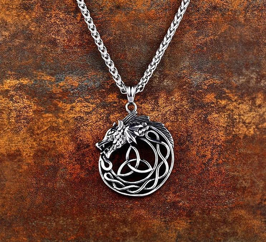 Silver Dragon Head Pendant Around Triquetra Symbol