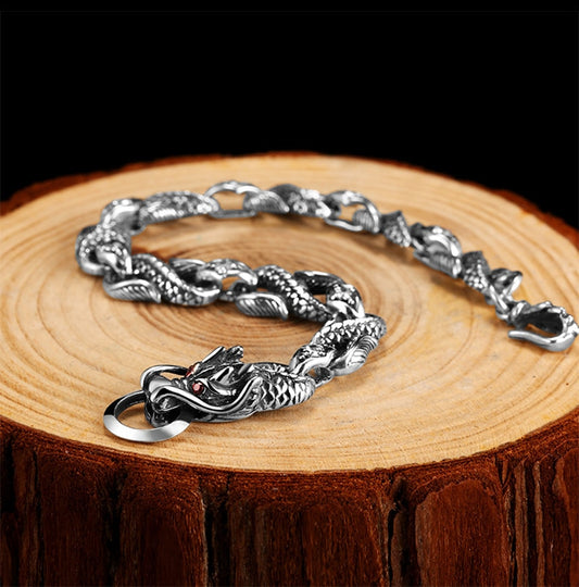 Silver Dragon Red and White Cubic Zirconia Stones 925 Sterling Silver Vintage Biker Bracelet