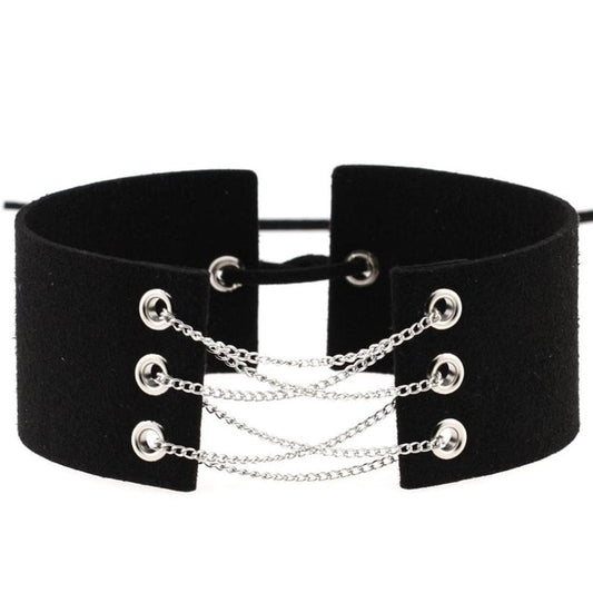 Velvet Leather Choker Necklace with Silver Chain Link and Lace-Up Closure
