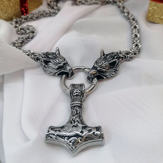 Thor's Hammer Pendant with Two Wolf Heads Byzantine Chain Necklace