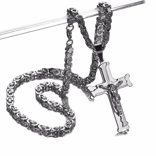 Multilayer Jesus Crucifix Pendant with Byzantine Chain Link Necklace