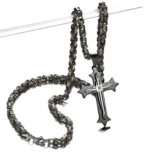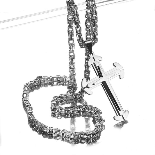 Stainless Steel Cross Pendant with Byzantine Link Necklace