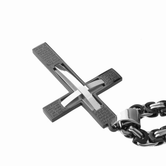 Black Cross Pendant with Silver Curved Cross Inlay and Lord's Prayer Engraving
