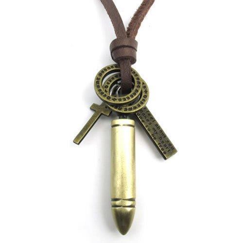 Vintage Bullet Cross Pendant Adjustable Brown Leather Cord Necklace Chain
