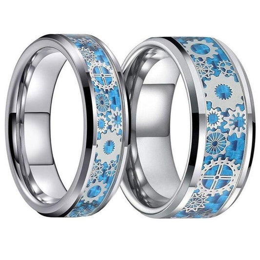 Blue & Silver Carbon Fiber with Gear Inlay Tungsten Matching Wedding Ring Set