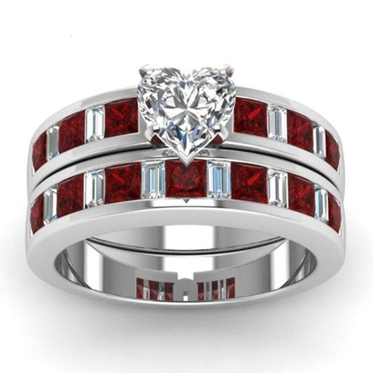 Red Koa Wood Inlay and Crystal & Rhinestone Heart Stainless Steel Wedding Ring Set