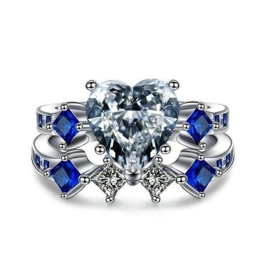 White/Blue Cubic Zirconia Heart and Blue Inlay Stainless Steel Wedding Bands Set