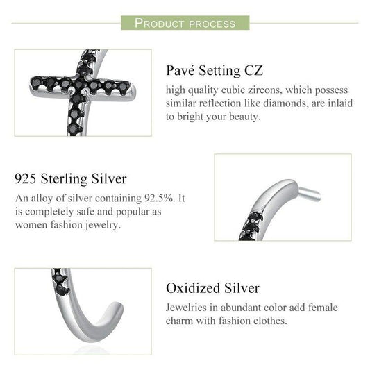 925 Sterling Silver Cross Hoop Earrings with Black Zircon
