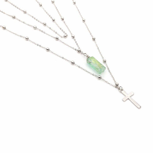 Silver Multi-layer Chain Necklace with Jade Crystal and Silver Cross Pendants