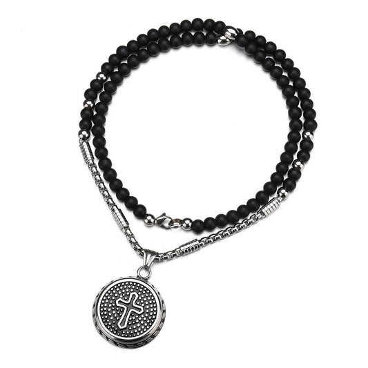 Obsidian Bead Necklace with Black Crystal Silver Cross Pendant