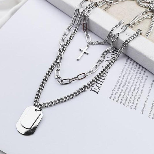Multi-Chain Silver Necklace with Cross and Dog Tag Pendants