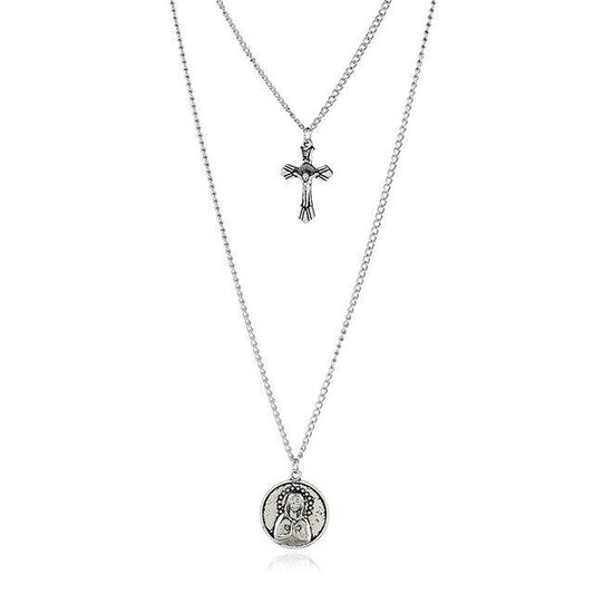 Cross and Mary Pendant on 2-Layer Chain Link Necklace