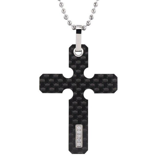 Carbon Fiber Cross Pendant Necklace with Zirconia Crystal Inlay