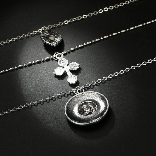 Multi-layer Antique Silver Necklace with 3 Symbolic Pendants