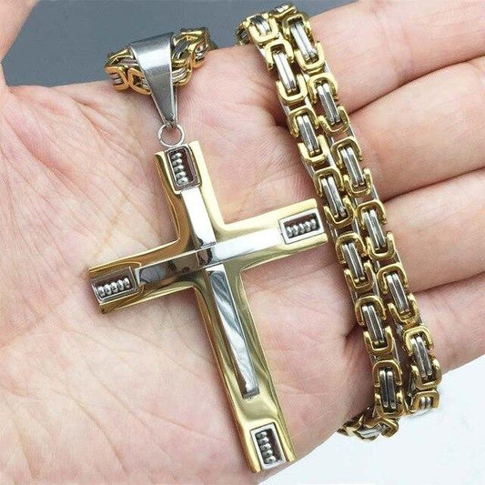 Three Tone Cross Pendant with Punk Byzantine Necklace