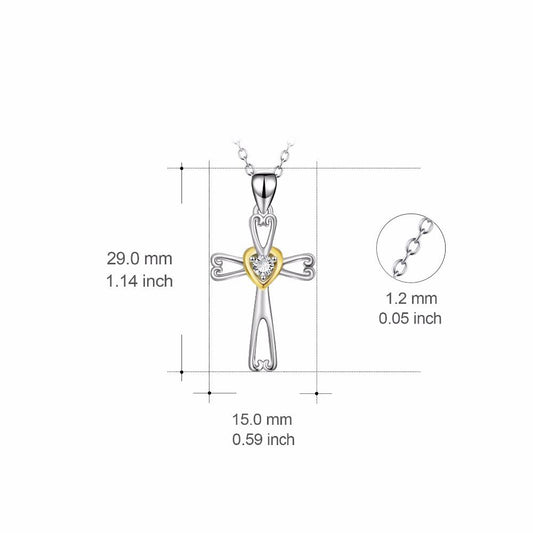 Two-Tone 925 Sterling Silver Cross Pendant with Gold Crystal Heart