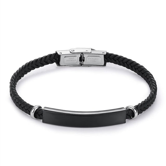 Custom Engrave Smooth Black Leather and Stainless Steel Fashion Bracelet