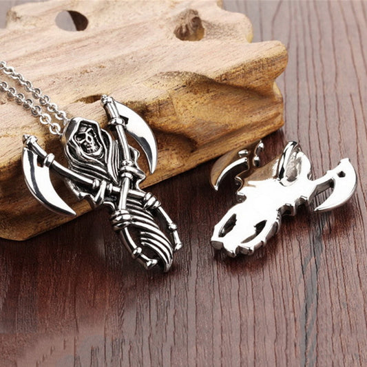 Stainless Steel Double Scythe Grim Reaper Pendant Necklace