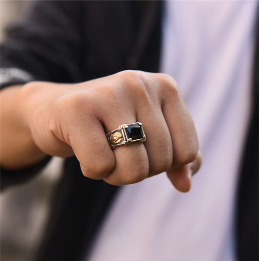 925 Sterling Silver Black Onyx Ring with Engraved Flower for Men