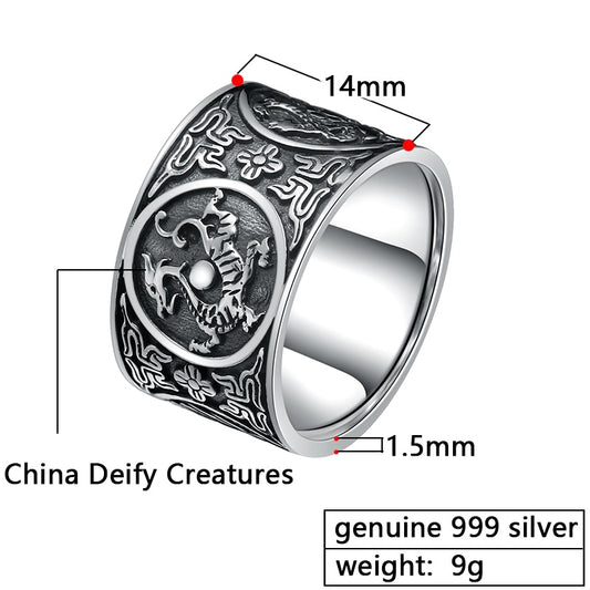 Chinese Four Creatures Dragon, Tiger, Bird and Turtle 999 Genuine Silver Vintage Biker Ring