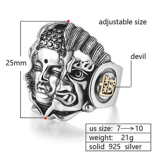 Gothic Buddha and Devil 925 Sterling Silver Adjustable Vintage Biker Ring