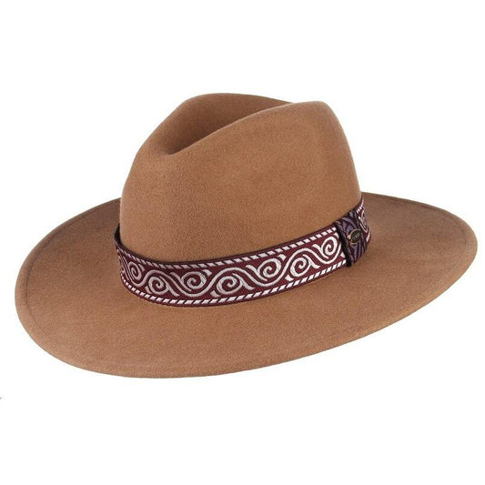 Wide Brim Wool Fedora Hat with Striped Vintage Band