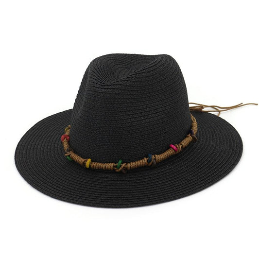 Vintage Straw Panama Hat with Leather Belt Bowknot
