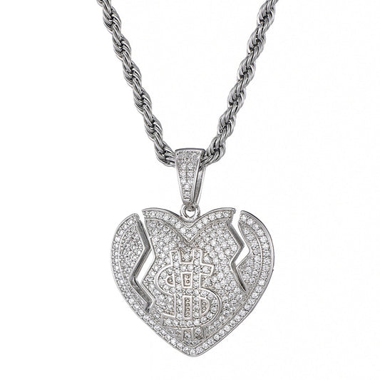 Micro Paved Cubic-Zirconia-Studded Broken Heart with Dollar Sign Bling Hip-hop Pendant Necklace