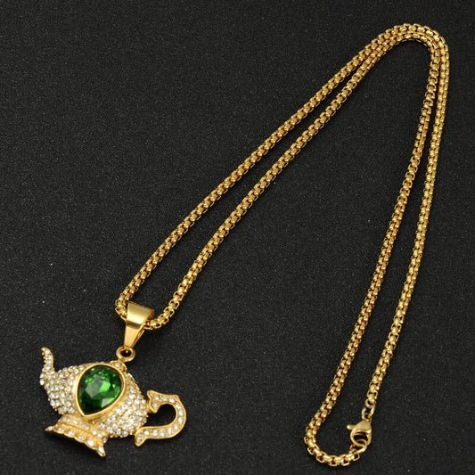 Gemstone-Studded Gold-Plated Aladdin Lamp Bling Stainless Steel Chain Link Hip-hop Pendant Necklace