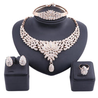Create an amazing look of yourself out of this Jewelry Set by Innovato Design. Every piece of these jewelries will make you shine like a star. Made of 316L stainless steel, this brilliant jewelry set comprises of a sleek, polished, and smooth surface as seen over its shank, ornament, earring backs, charms, link chain, and pendant. The necklace has flower-shaped and leaf-shaped gold or silver steel that are ingrained with crystal channel-set white round brilliant cut stones. Also, the bracelet has a design that is similar to the necklace pendant. Moreover, the earring charms have the same design as the necklace pendant so as the ornament of the ring.