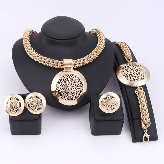 Gold/Silver-Plated Circle with Flower Patterns Necklace, Bracelet, Earrings & Ring Wedding Jewelry Set