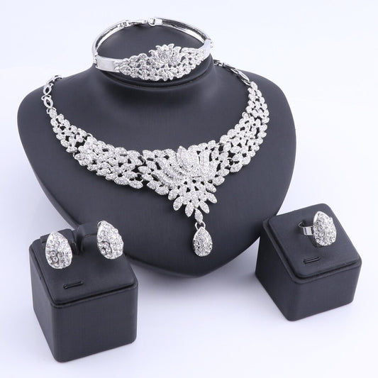 Flower Crystal Necklace, Bracelet, Earrings & Ring Wedding Statement Jewelry Set