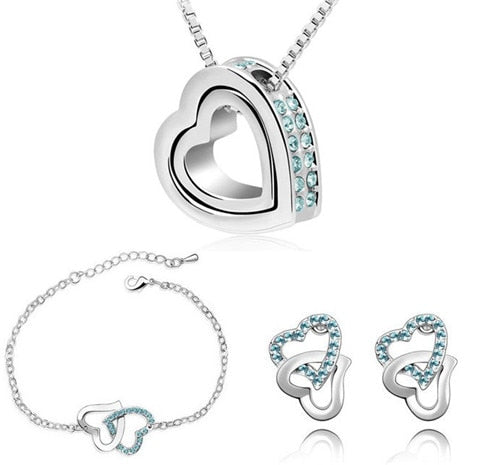 Double Heart Rhinestone Necklace, Bracelet & Earrings Fashion Wedding Jewelry Set
