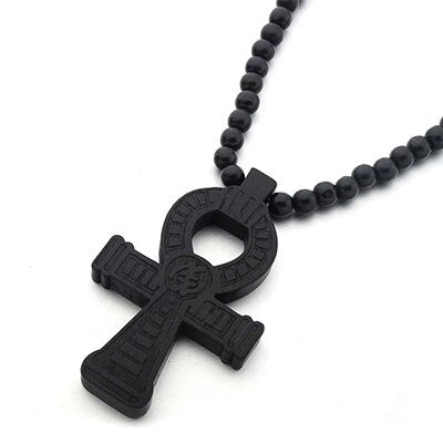 Wood Round Beads and Handmade Elastic Africa Egyptian Ankh Vintage Hip-Hop Necklace