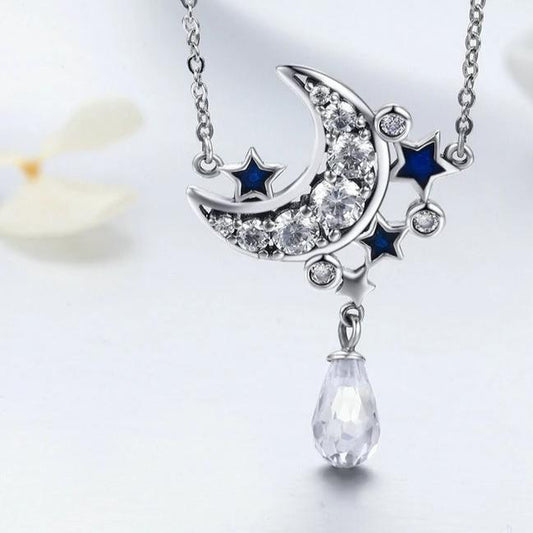925 Sterling Silver Crystal Crescent Moon and Blue Star Pendant Necklace