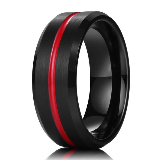 Thin Red Groove Black Brushed Tungsten Carbide Wedding Band Ring Comfort Fit