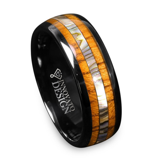 8mm Tungsten Carbide Black Ring with Koa Wood and Abalone Inlay
