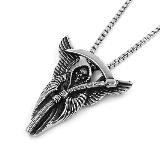 Stainless Steel Winged Grim Reaper with Scythe Pendant Necklace