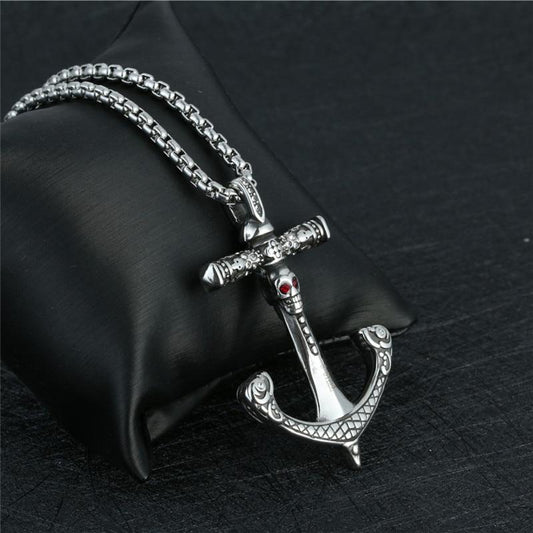Silver Crystal Red-Eyed Skull Anchor Pendant Necklace