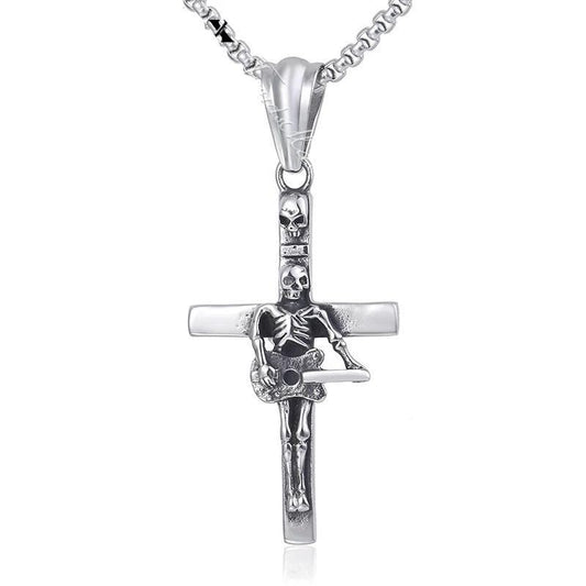 Stainless Steel Cross Pendant with Skeleton Playing Guitar Necklace