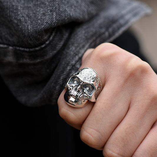 Gothic Lotus Mask Big Skull 925 Sterling Silver Adjustable Vintage Punk Rock Hip-hop Biker Ring
