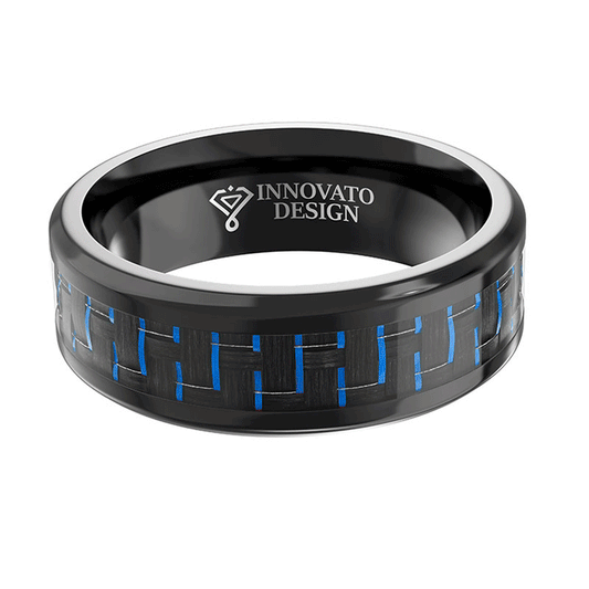 8MM Men Titanium Ring Wedding Band Black Plated with Black and Blue Carbon Fiber Inlay