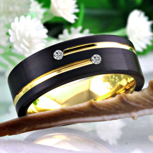 Classic Golden Groove Cubic Zirconia Black-Plated Tungsten Wedding Band