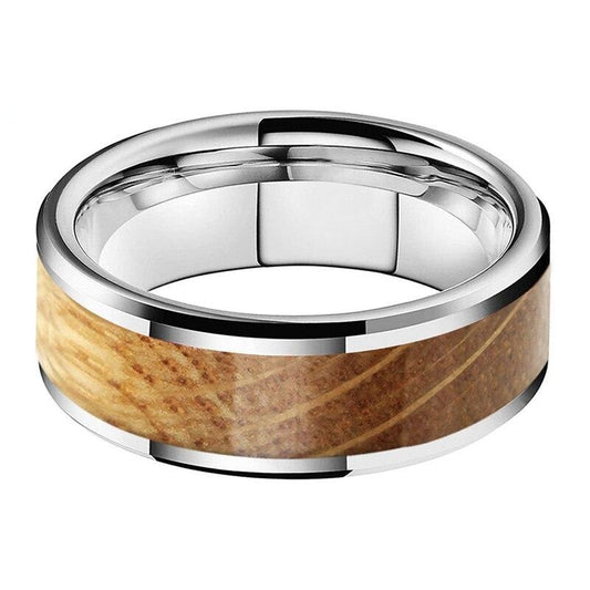 8mm Whiskey Barrel Oak Wood Inlay Flat Band and Beveled Edges Tungsten Wedding Band
