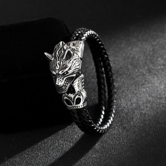 Leather Stainless Steel Bracelet for Men Cuff Braided Bangle Wolf Heads Bracelet