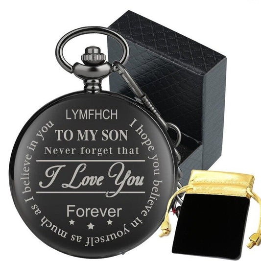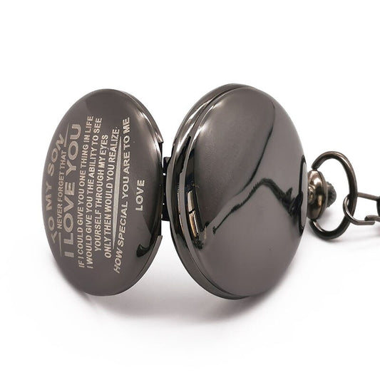 "To My Son Love Dad" Retro Black Engraved Greeting Quartz Pocket Watch