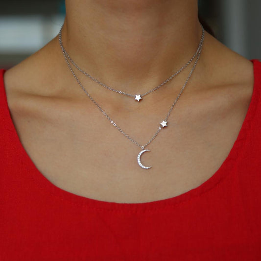 Platinum Silver Multi-layer Crescent Moon and Star Chain Necklace