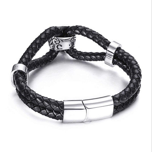 Black Two Strand Braided Leather Stainless Steel Skull Bracelet