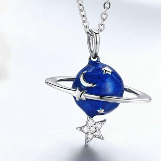 Blue Planet, Star, and Moon 925 Sterling Silver Fashion Pendant Necklace